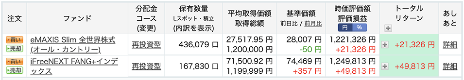 オルカンは+21,326円、FANG+は+49,813円で、合計71,139円のプラス!