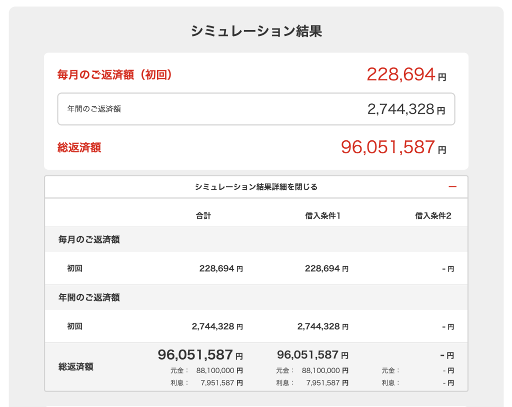 8,810万円のローンを組むと、月々の返済は228,694円。